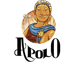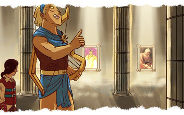 Ilustração do templo. Descrição da imagem: Três rapazes seguem o deus grego Apolo pelo interior do templo de mármore branco. O teto é bastante alto e colunas estão espalhadas por todo o saguão. Fachos de luz iluminam as obras de arte penduradas nas paredes. Apolo segue carregando o arco e seu instrumento.
