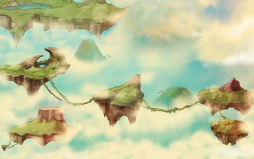Ilustração de ilhas suspensas. Descrição da imagem: Uma ilustração que exibe um conjunto de ilhas que flutuando no céu, com cachoeiras caindo no infinito e uma agradável sensação de paz… Um lugar mágico!