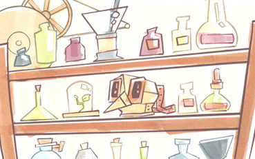 Ilustração de uma prateleira de laboratório. Descrição da imagem: Uma ilustração exibe uma parte de uma estante de laboratório com três prateleiras, nelas tubos de ensaio,buretas, bastões de vidro estão dispostos. No um objeto de metal em formato de cabeça de coruja.