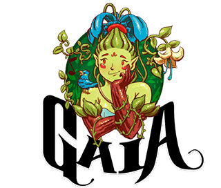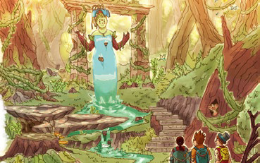 Ilustração de Gaia: Descrição da imagem: Daniel, Gerson e Wilson aparecem em um lugar exuberante, repleto de plantas, flores, rochas e animais. Em uma parte mais elevada do terreno, Gaia surge das águas do riacho que corta a paisagem. Não é possível distinguir onde começa o vestido - cachoeira da deusa e onde começa o leito do riacho. Os três jovens estão carregam mochilas nas costas.